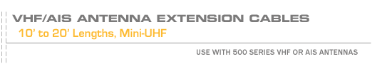 An easy solution to extending the cable on Digital Antenna’s 500 series VHF and AIS antennas by 10' or 20'. Simply connect the included double mini-UHF male adapter between the 500 series antenna’s mini-UHF female connector and the 500 series extension cable’s mini-UHF female connector. The cable’s other end accepts the 500 series antenna’s PL-259 adapter.