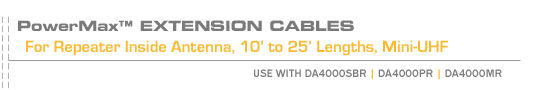 Easily extend your PowerMax™ DA4000SBR, PR or MR repeater’s inside antenna by 10' to 25'. For the SBR and MR repeaters, these cables attach between the repeater’s inside antenna (135-RD) and the repeater unit. For the PR, the cable attaches between the repeater unit and the included 15' cable. The 20' and 25' lengths are made with DA340 cable to minimize signal loss.