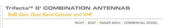 When space and mounting locations are limited, Digital Antenna’s Trifecta™ combination antennas work overtime, providing you with multi-purpose performance to meet your communication, navigation or entertainment needs. Choose from a selection of high quality 8’ antennas, with VHF, cellular and PCS or AM/FM, cellular and PCS combinations. Trifecta™ tri-band antennas are designed to work with all cellular systems in North America and are compatible with our PowerLogic™ North American amplifiers.